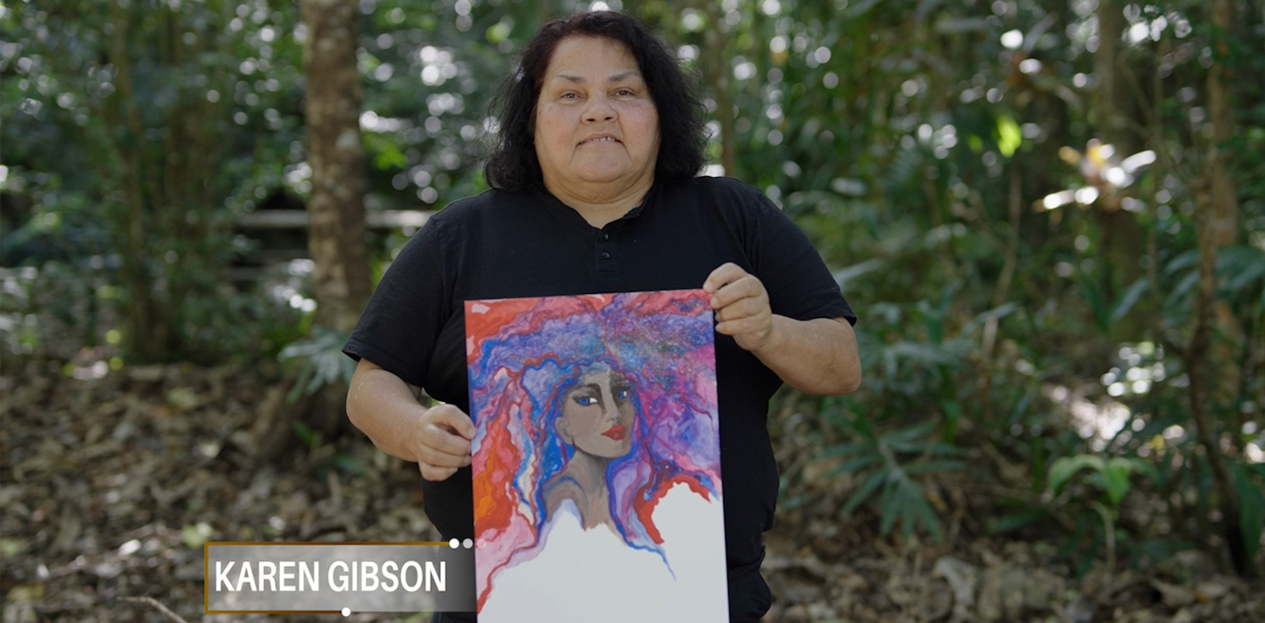 Karen Gibson is a nationally acclaimed artist and Chairperson of Yalanji Arts, where stories are carried through canvas, colour and culture. Based in Mossman Gorge, Karen’s work reflects deep connection to rainforest country, traditional knowledge and the lived experiences of her community.
